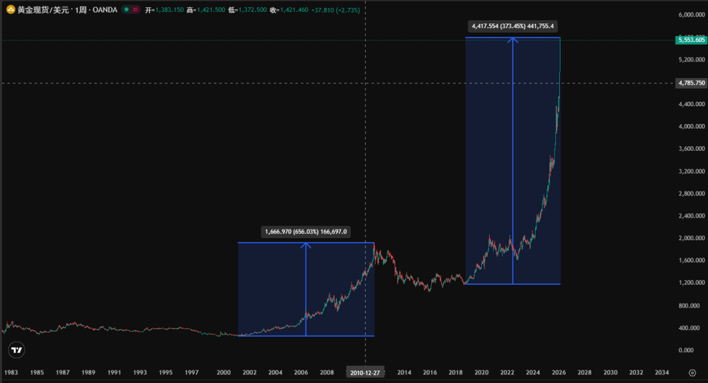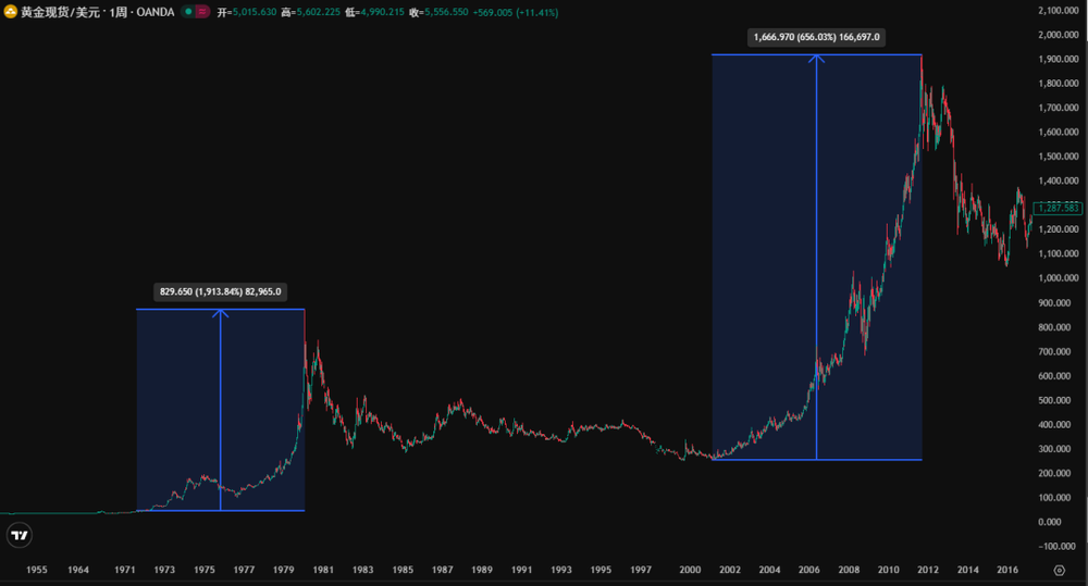 横跨约10年的两轮超级牛市,黄金分别上涨20和7倍