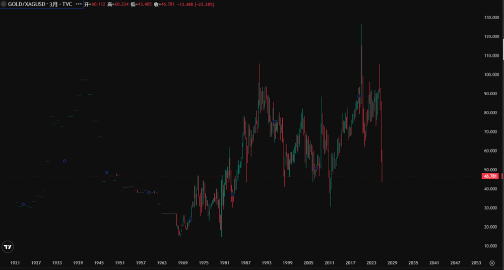 产生这一问题的核心在于,白银价格在数十年间长期被打压,处于低位。因此,在人类历史上少有的这几十年中,白银被视作工业属性优先于货币属性的贵金属,白银价格也在长期打压中,形成了横跨约45年、近乎完美的杯柄形态。而由于金融衍生品的发达,美国在纸白银规模快速扩张的过程中,并没有大规模增加相应比例的实物白银库存,使得其在遇到实物挤兑时极其脆弱。