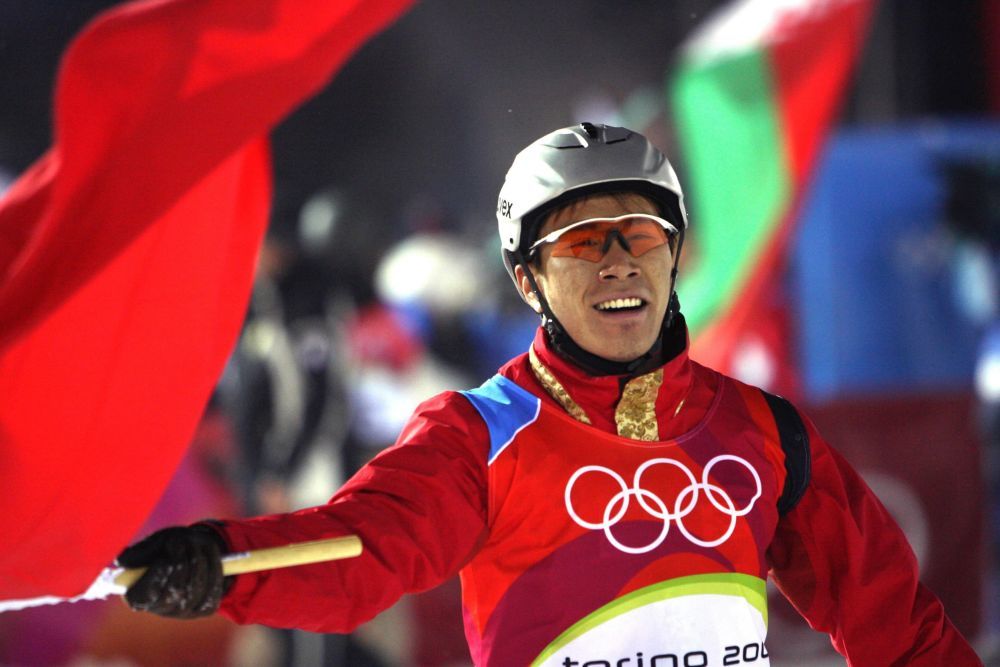 ↑2006年2月23日,韩晓鹏在都灵冬奥会自由式滑雪男子空中技巧比赛中夺得金牌。