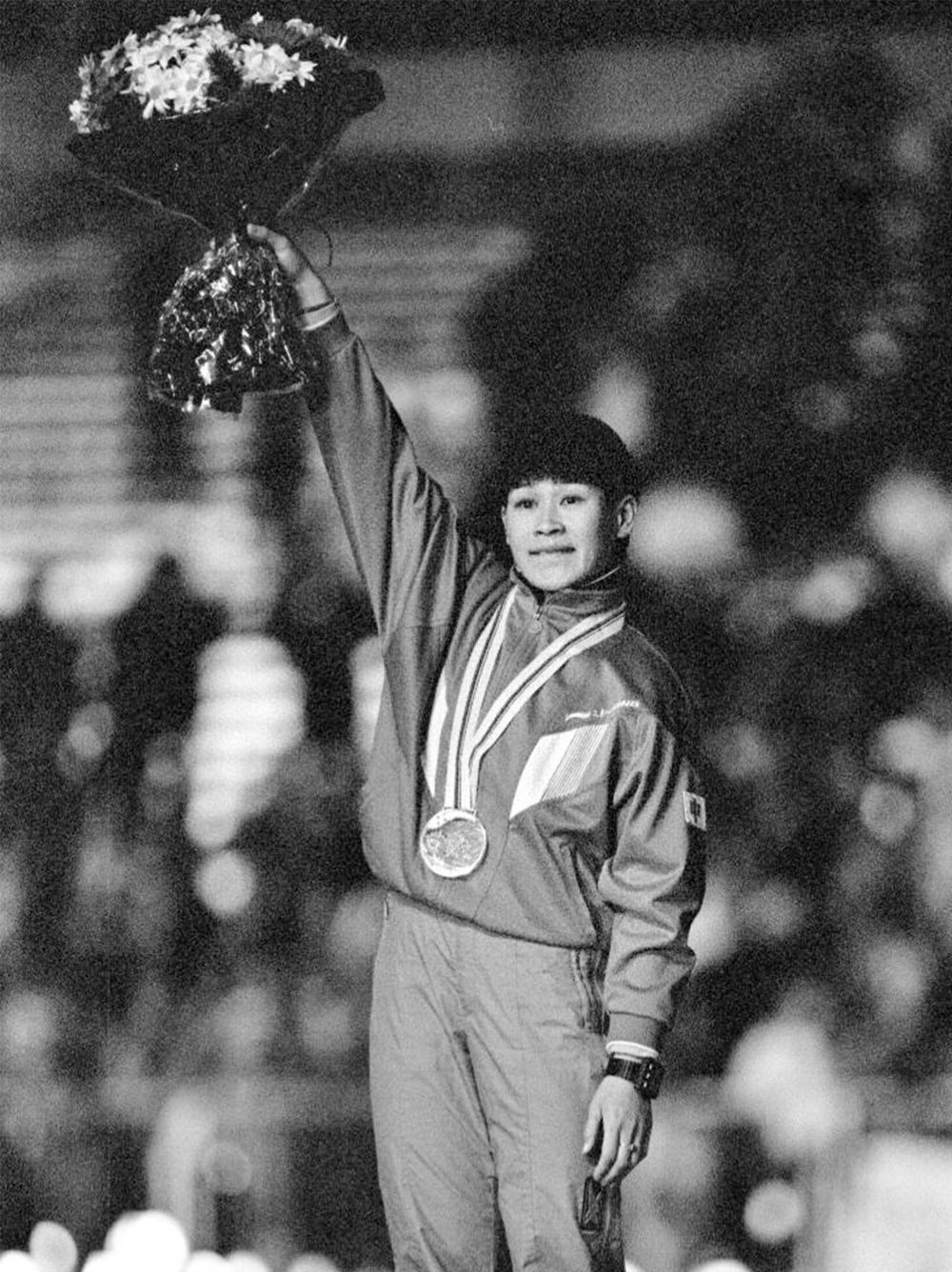 ↑1992年2月10日,获得阿尔贝维尔冬奥会速度滑冰女子500米银牌的叶乔波在颁奖仪式上。