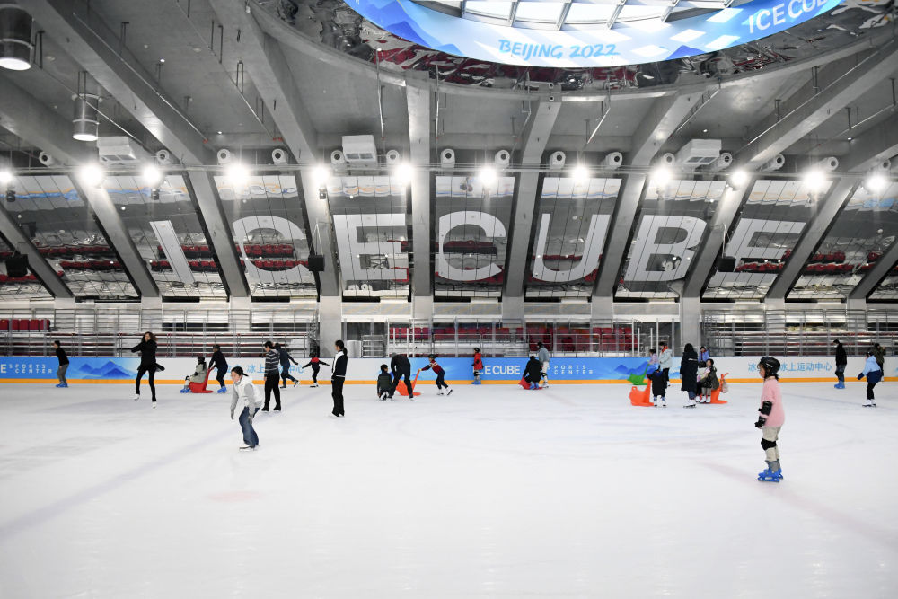 ↑2023年1月23日,游客在“冰立方”冰上运动中心滑冰。