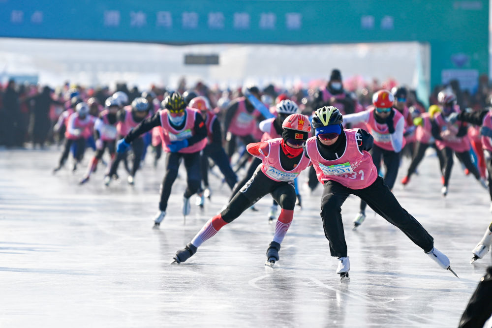 ↑2024年1月30日,参赛者在首届中国·吉林松花江滑冰马拉松挑战赛中从起点出发。