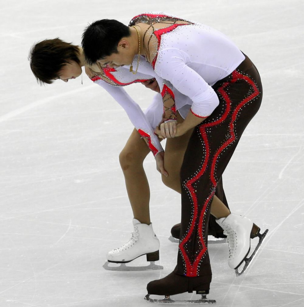 ↑2010年2月14日,庞清(左)/佟健在温哥华冬奥会花样滑冰双人滑短节目比赛中。最终,他们获得双人滑比赛亚军。