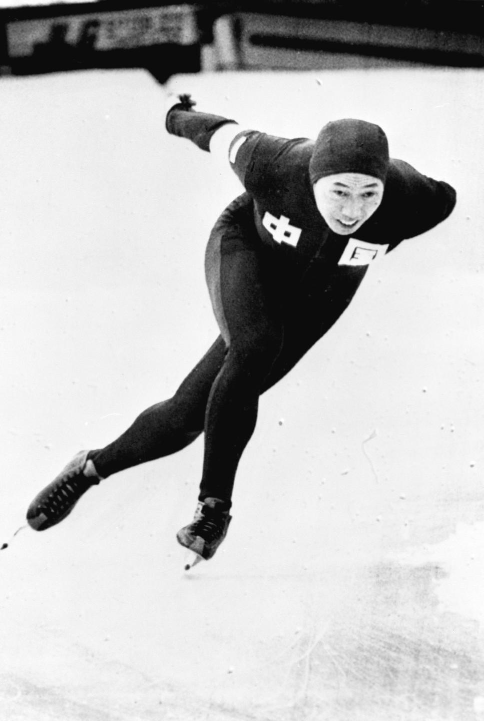 ↑1980年2月19日,赵伟昌在普莱西德湖冬奥会速度滑冰男子1000米比赛中。