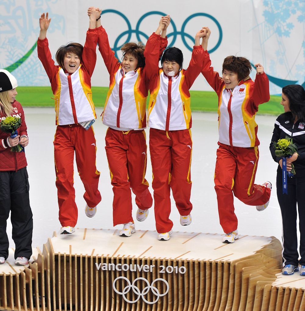 ↑2010年2月24日,孙琳琳、王濛、张会和周洋(从左至右)在温哥华冬奥会短道速滑女子3000米接力比赛颁花仪式上庆祝。