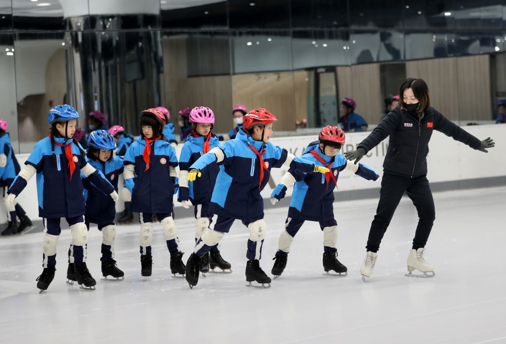 ↑2021年12月22日,在上海新世界城的冰雪乐园,黄浦区卢湾一中心小学的学生在教练的指导下练习滑冰。