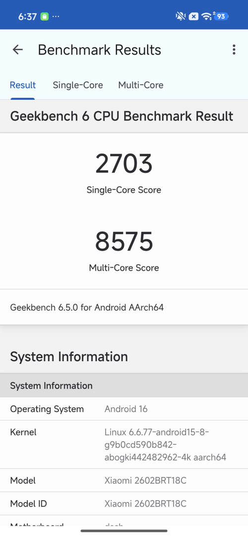 GeekBench 6的单核心分数为2703,多核心分数为8575.