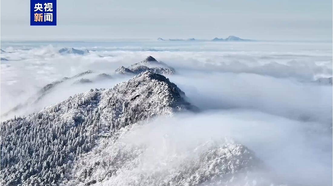 近日,安徽九华山风景区出现罕见流云奇景。流云穿峰而过,奔腾如涛。皑皑白雪为底色,云海翻涌,整座山如梦似幻。(总台记者 王宁 邵鑫扬)