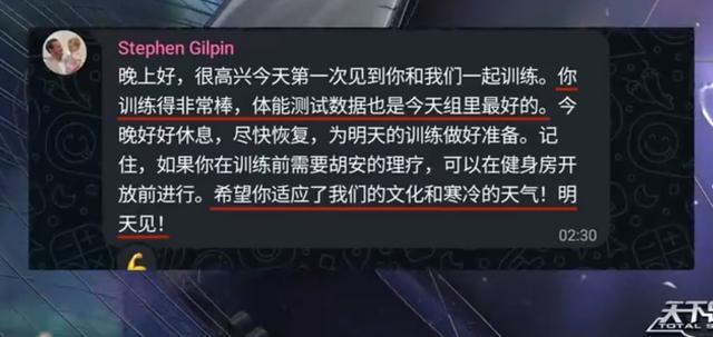 在纪录片中,还有一个温馨的小细节颇为令人感动,在徐彬完成体能测试后,狼队运动表现副主管史蒂芬特意将体测结果以及建议翻译为简体中文,发给徐彬,并对他的表现给予了肯定与鼓励。
