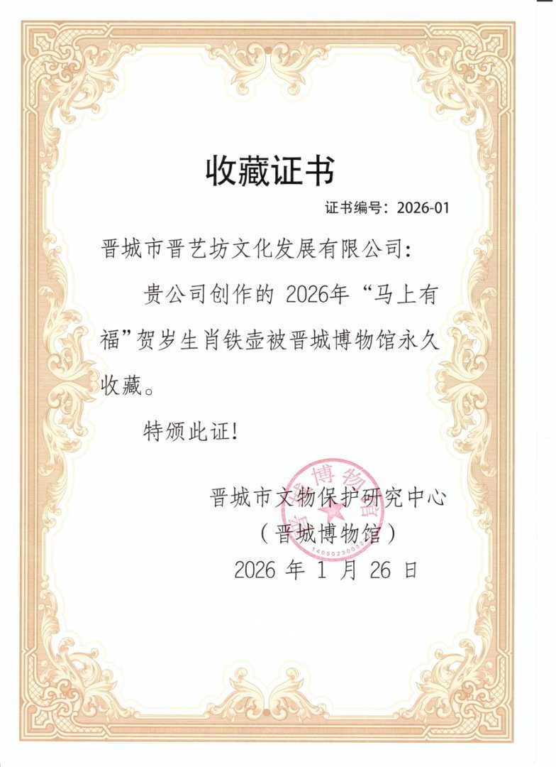 铁壶之中,盛的是滚烫茶水,承载的却是晋城千年冶铁文脉、手工艺人的温度与情怀,以及新春纳福的美好愿景。此次双馆收藏,既是对晋艺坊非遗技艺与匠心创作的高度认可,更是对晋城地域文化传承与创新的肯定。