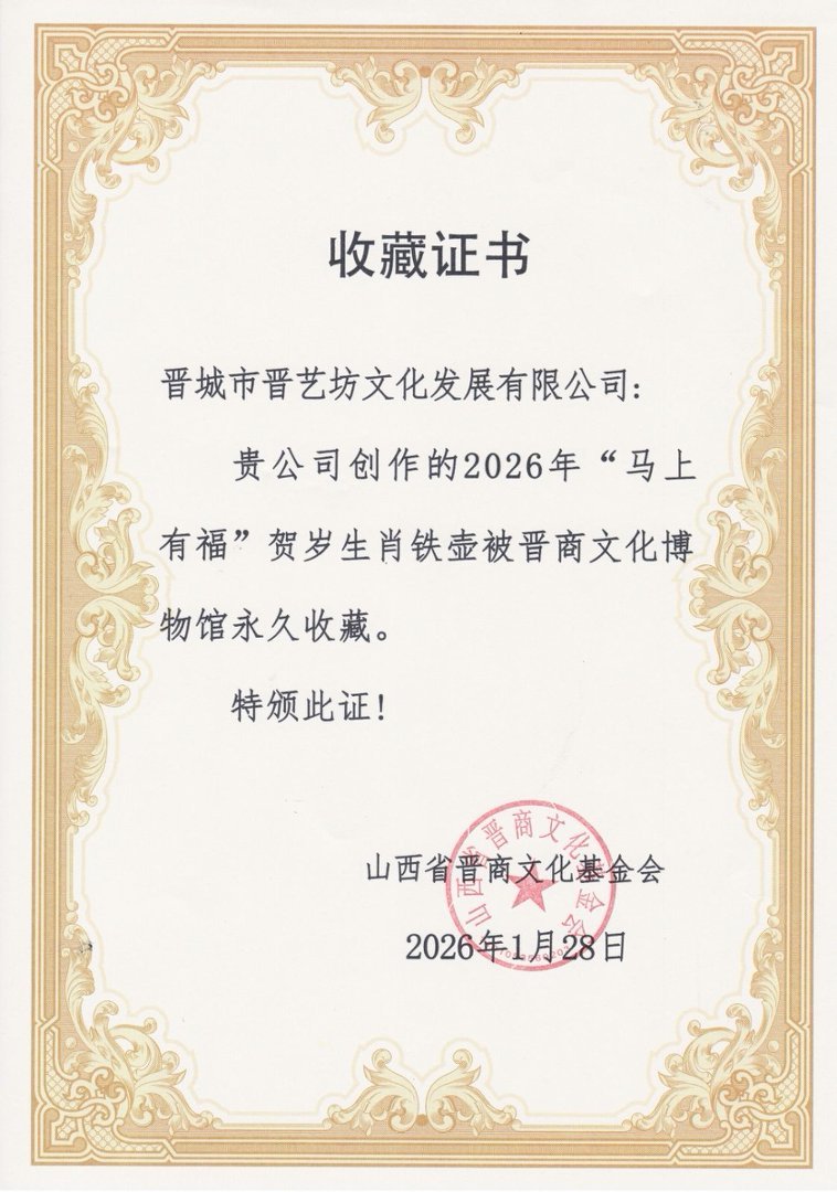 2026丙午马年新春将至,“三晋老字号”晋艺坊匠心打造的《马上有福》马年生肖铁壶,正式被晋城博物馆、晋商文化博物馆双馆收藏。这件融晋城千年冶铁技艺、生肖文化与晋商底蕴于一体的臻品,以“马踏祥云驮福至,壶纳瑞气送禄来”的美好意蕴,成为晋城地域文化传承的经典范本,让非遗匠心在文博殿堂永续绽放。