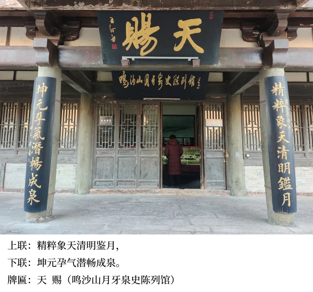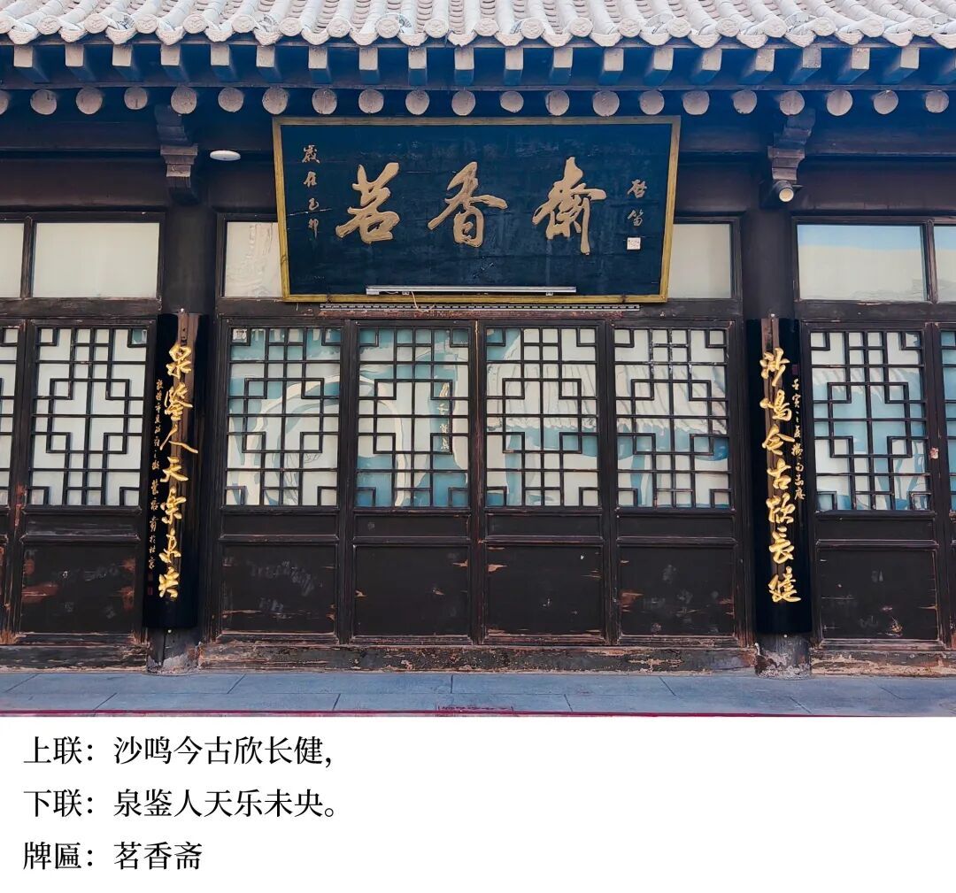 赏析:此联意境旷达,意蕴悠长。沙鸣之声,贯古通今,似赞天地的长健不息;泉清如镜,映照人天,似抒人生的欢乐未央。“今古”写时间的绵长,“人天”绘空间的辽阔,将沙泉的恒久与人生的豁达相融,读之如品香茗,心旷神怡,牌匾“茗香斋”更添几分雅趣,与联中意境相得益彰。