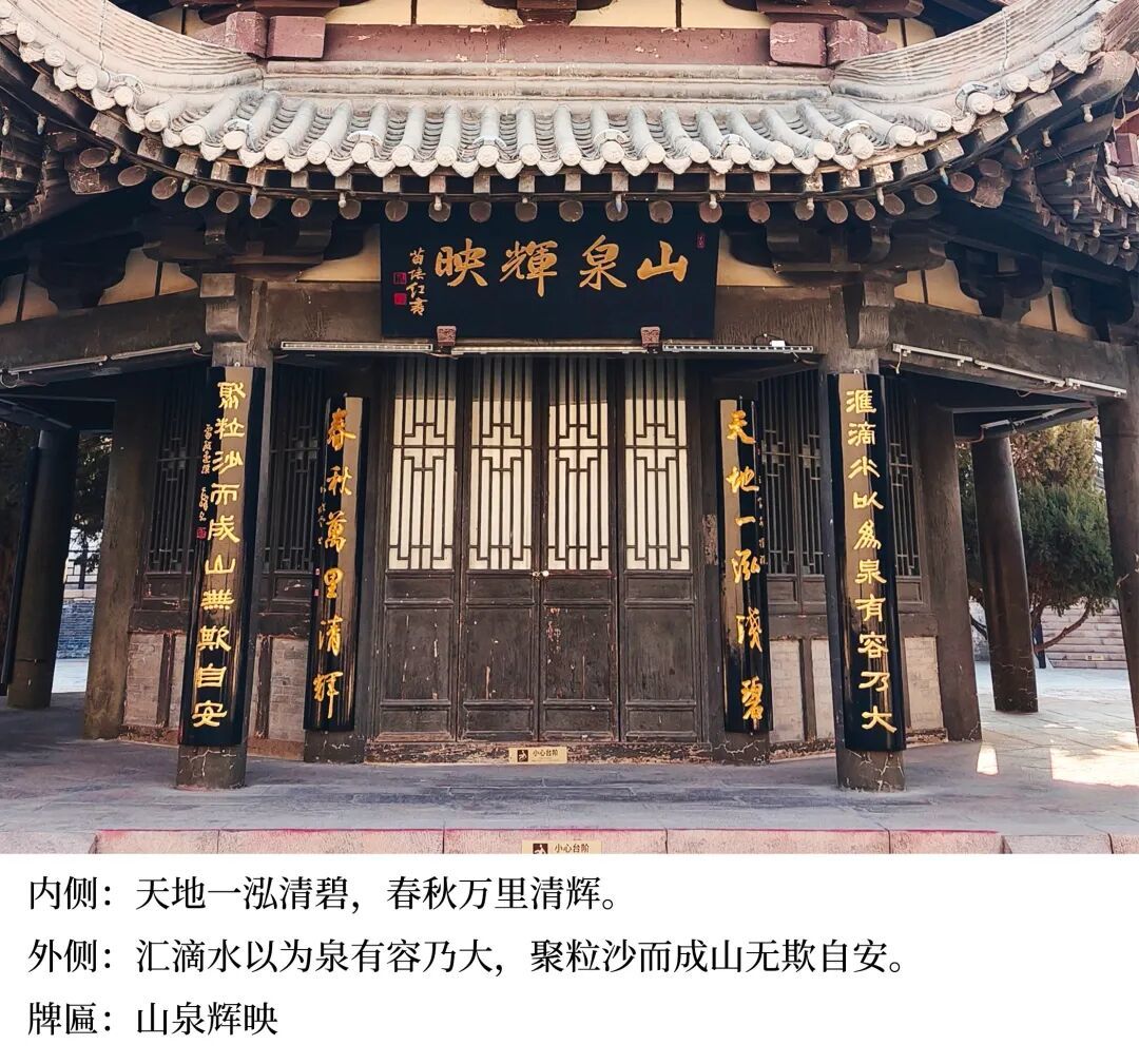 赏析:内侧联绘景清奇,“天地一泓清碧”写月牙泉的澄澈,“春秋万里清辉”赞泉光的绵长,将泉景的清美与天地的辽阔相融;外侧联喻理深刻,以“汇滴水成泉”喻人当有包容之心,以“聚粒沙成山”喻人当守真诚之念,将自然景致与处世哲思完美结合。牌匾“山泉辉映”点明山与泉的相依相衬,与联中景、理皆契合。