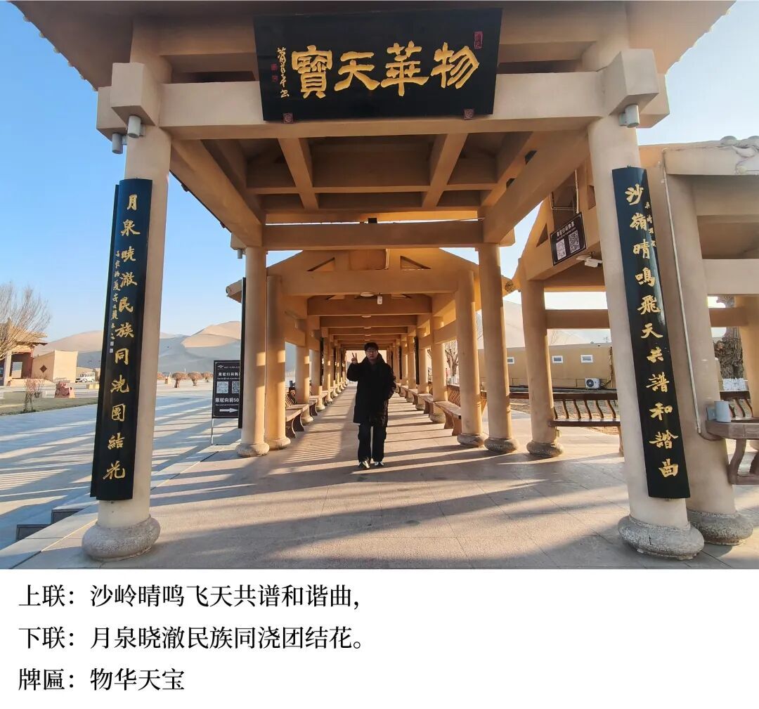 赏析:此联将自然景致与人文情怀相融,意蕴温暖。沙岭晴鸣,似与飞天共谱和谐之曲;月泉晓澈,如助民族同浇团结之花。“飞天”承敦煌文化,“民族”抒家国情怀,既赞沙泉的自然之美,又颂人文的和谐之美,牌匾“物华天宝”赞此地为物华天宝之地,与联意契合。