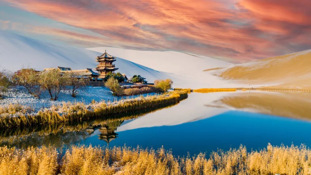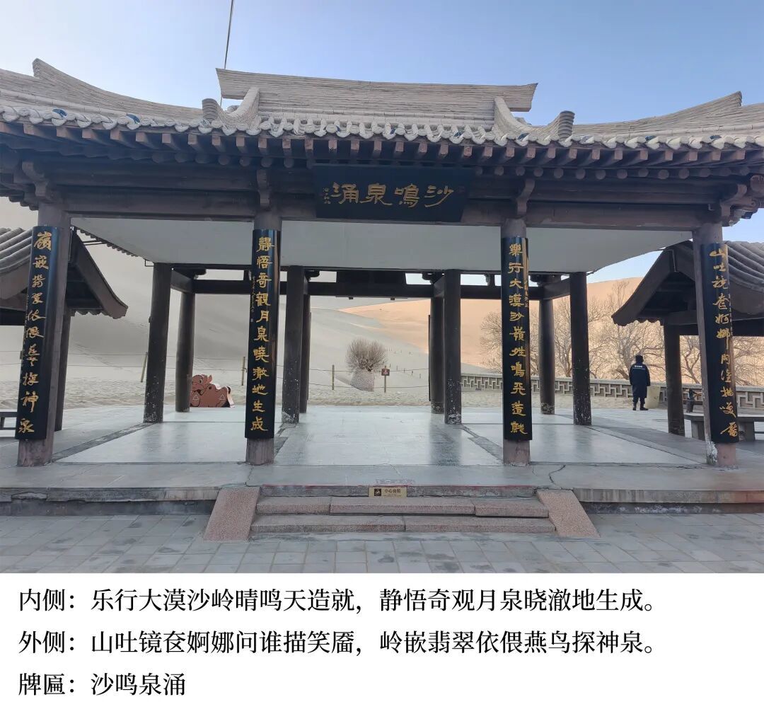 鸣沙山月牙泉的楹联,如散落于大漠的明珠,每一副都藏着独特的意境与情思。它们或悬于亭台,或嵌于廊柱,与沙山、清泉、清风、明月相伴,将自然之美、人文之韵、禅思之境,尽数凝于笔端,读来唇齿留香,心向往之。