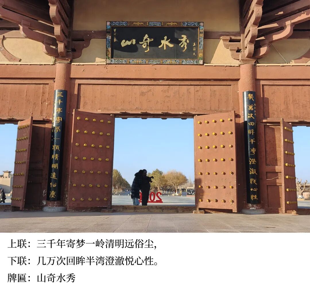 赏析:此联以时空为脉,抒怀寄情。三千年的岁月,寄梦于鸣沙山的清明,远隔俗尘;几万次的回眸,沉醉于月牙泉的澄澈,悦己心性。“三千年”“几万次”极言时间的绵长与情感的深沉,“清明”“澄澈”赞沙泉的清灵,将历史的厚重与自然的清美相融,牌匾“山奇水秀”恰如其分地概括了鸣沙山月牙泉的景致特质。