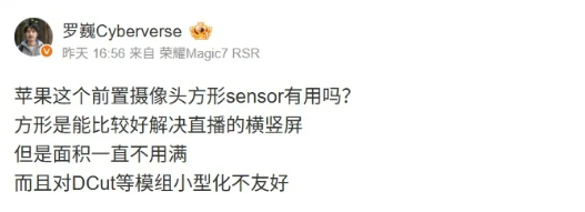 从产品定位与技术权衡来看,方形传感器更可能成为一种“高端或专属特性”。方形传感器虽然提升了体验,但也存在物理局限。荣耀罗巍指出了两点:一是“面积一直不用满”,在输出标准矩形照片时,传感器角落区域实际被裁剪,存在物理像素的浪费;二是“对DCut等模组小型化不友好”,其形状可能对追求极致轻薄或复杂多摄模组(如潜望式长焦)的堆叠设计带来挑战。因此,它可能更适合对前置影像体验有极致追求的旗舰机型或特定产品线,而无法在所有设备上全面普及。