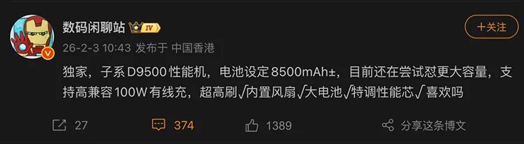 据博主@数码闲聊站 独家爆料,某款子系D9500性能机的电池有所增加,并且还在尝试更大的电池。而另一大的特点是,它也上了内置风扇。这款手机预计是REDMI K90至尊版,所以这将会是小米阵营里首款配备了风扇的手机。