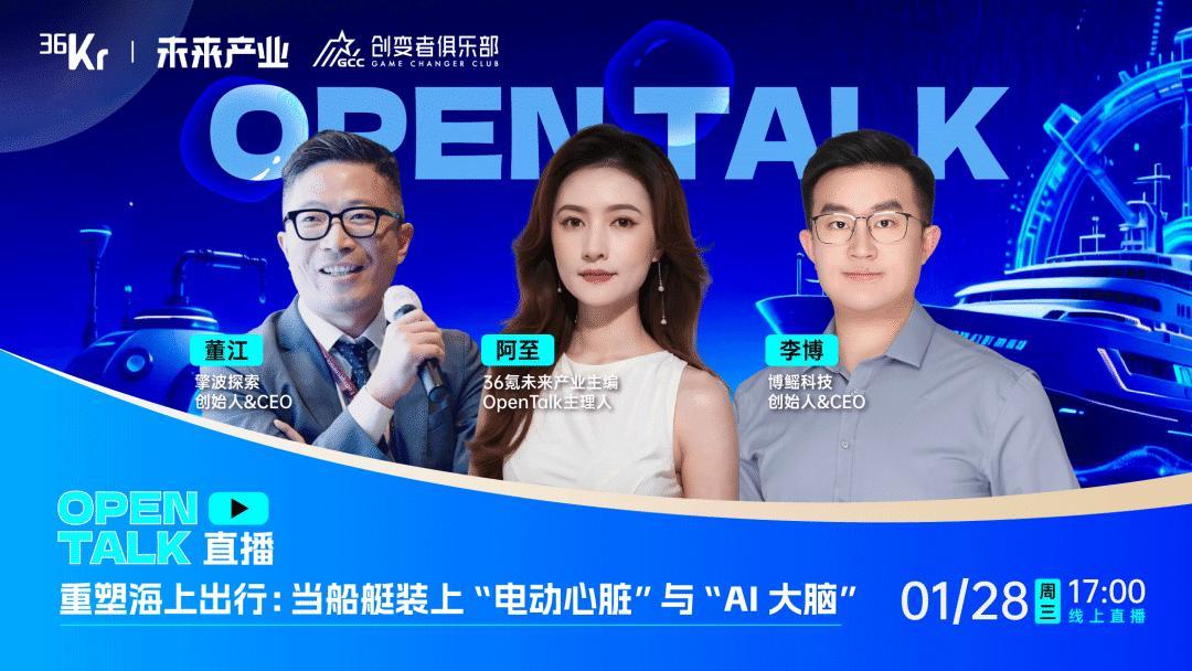 1月28日,36氪举办了以「重塑海上出行:当船舶装上“电动心脏” 与 “AI 大脑”」为主题的OpenTalk直播活动,特别邀请擎波探索创始人&CEO董江、博鳐科技创始人&CEO李博作为本场分享嘉宾,就高性能电动舷外机、新能源出海、全航程自主航行任务、全场景智能航行解决方案等话题展开了深入分享,并与观众进行了在线互动。