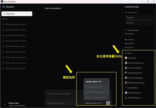 系统可根据任务自动筛选并推荐最适合的Skills和模型,提高多任务处理效率,让用户操作更省心。用户亦可手动选择Skills和模型去解决多任务场景痛点,让操作更灵活。