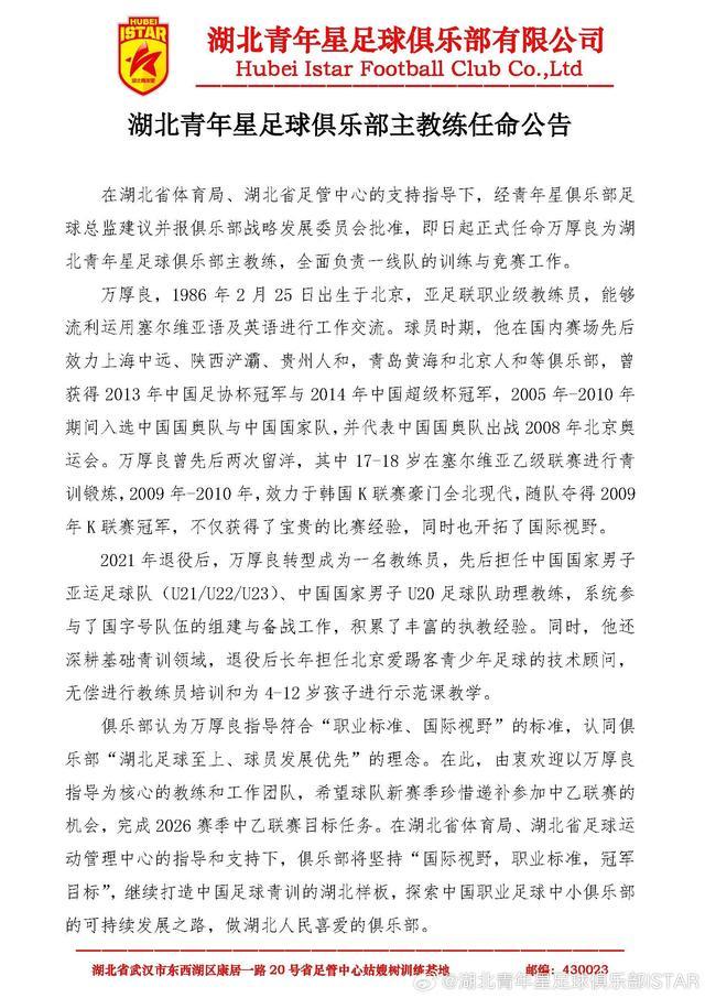 在湖北省体育局、湖北省足管中心的支持指导下,经青年星俱乐部足球总监建议并报俱乐部战略发展委员会批准,即日起正式任命万厚良为湖北青年星足球俱乐部主教练,全面负责一线队的训练与竞赛工作。