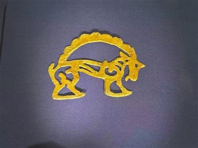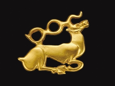 制作于公元前4世纪至前3世纪的大角羊形车饰是在一片金箔上剪出角羊的形状。类似饰物在甘肃马家塬和内蒙古草原游牧民族墓葬中多有发现,用金、银、青铜等金属制作,装饰在马车构件和轮子上。此类羊形饰片类似甘肃草原贵族所乘坐马车的配饰,它们会被用来装饰车轮,当车辆行驶时,动物在滚动的车轮上看起来像在奔跑一样。