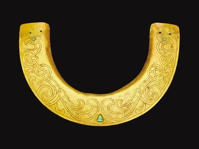 璜形项饰由锤揲(yè)而成璜形,中部宽,两端渐窄,素面抛光,两端有穿孔。类似的项饰还发现于北京、辽宁和内蒙古等北方地区的遗址中,这些地区在公元前六至五世纪生活着北方草原部族。展厅中有一件兽面纹璜形项饰的外形与北京地区所发现的项饰相似,唯表面刻画兽面纹。兽面纹长角卷曲,与表现躯干的条带交缠,分别向两端延伸。战国至汉朝时,这种兽面纹饰被中原贵族广泛应用在玉璧上。