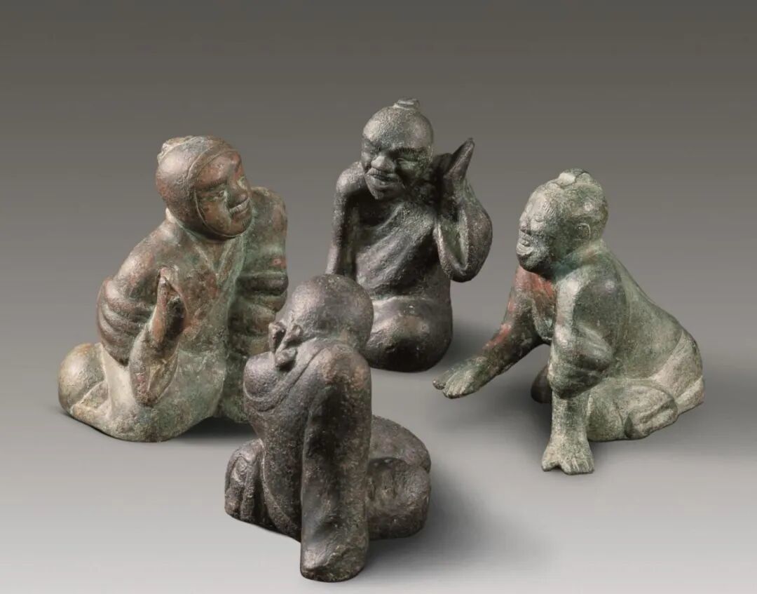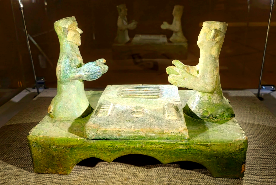 此外,这尊出自甘肃灵台的铜俑,还默默诉说着地域文化交流的故事。灵台地处陇东,是古代关中通往河西走廊的要冲之一,文化上深受中原与秦陇影响。此俑造型朴实,手法简洁,与中原地区同类器物风格一致,是汉代大一统文化在边疆地区广泛传播与深入影响的明证。它可能由当地工匠仿中原样式制作,也可能直接来自中原。无论如何,它证明了博戏文化作为汉代普遍性文化生活的一部分,其影响已远达帝国西陲。