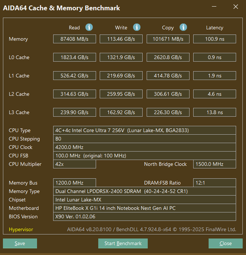 在内存方面,这款机型板载了16GB LPDDR5x-8533MT/s双通道内存,通过AIDA64实测,其读取、写入、复制带宽均超过80000MB/s,性能强劲,为多任务处理和运行本地AI大模型提供了充裕的带宽支持。