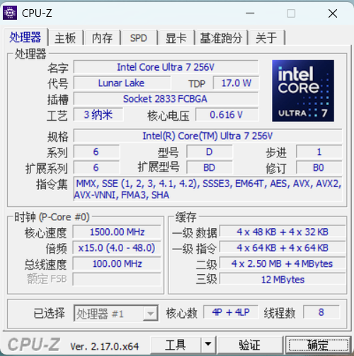 HP EliteBook X G1i的核心亮点在于其搭载了全新第二代英特尔酷睿Ultra 200V系列处理器。我们评测的机型配置为酷睿Ultra 7 256V处理器,采用Intel4制程工艺,拥有4个性能核(P-core)和4个能效核(E-core),共8核心8线程,最大睿频可达5GHz,集成英特尔Arc显卡。