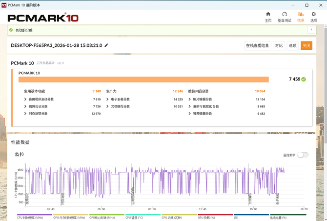 综合性能:PCMark10 Extended综合得分7459,其中数字内容创作子项得分高达10064,生产力子项也超过12000分,足以应对复杂办公与轻度创作任务。