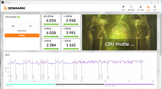 在3DMark CPU Profile测试中,单线程的成绩为1165,最大线程得分6034。