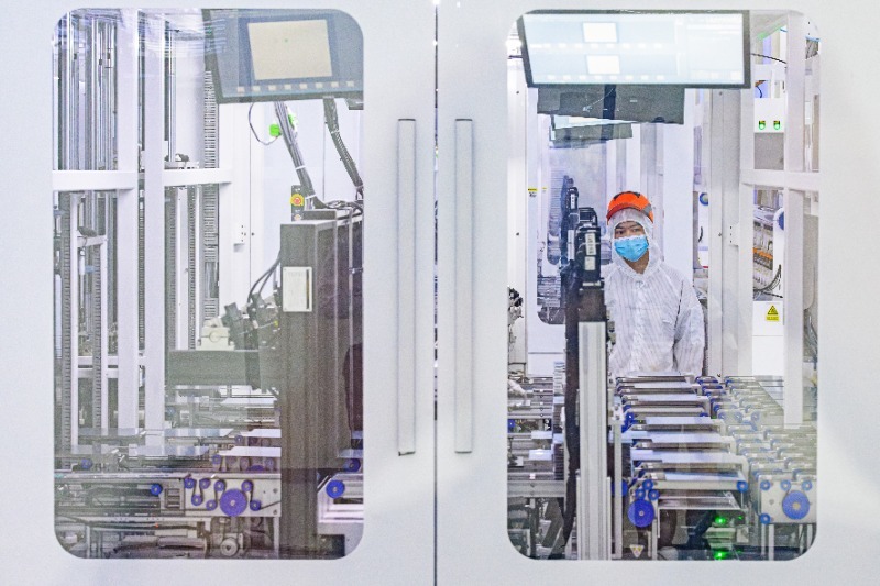 位于来安县汊河镇的滁州捷泰新能源科技有限公司内,工人正在生产线上生产新型高效太阳能电池。计成军/摄