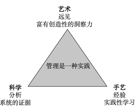 明茨伯格关于管理是艺术、手艺和科学的结合的观点如上图所示。在明茨伯格看来,只有当艺术、手艺和科学这三个维度结合在一起时才会出现有效的管理。艺术激发灵感,促进融合;手艺以实际经验为基础,实现融会贯通;科学则对知识进行系统分析,做到有条不紊。