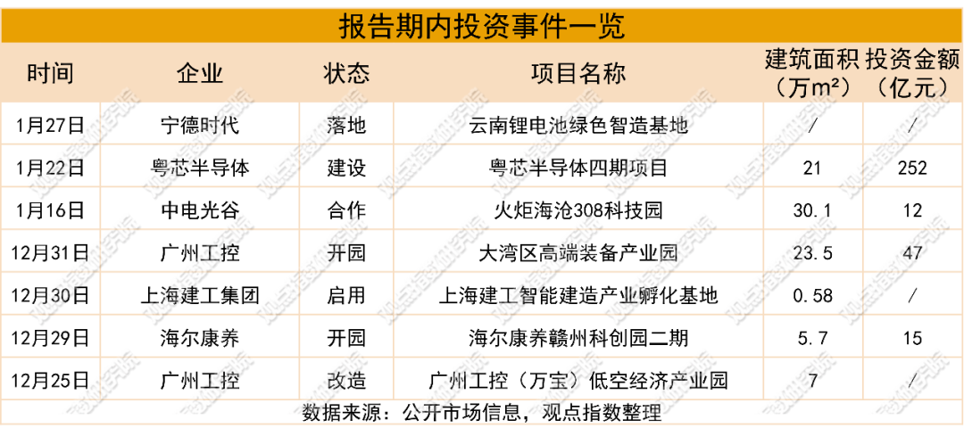 报告期内,经观点指数不完全统计,共监测到7起产业投资事件动态。产业园区建设与工业资产流通市场双向活跃,各地依托优质项目打造特色产业生态,通过模式创新与全链条布局激发产业活力。