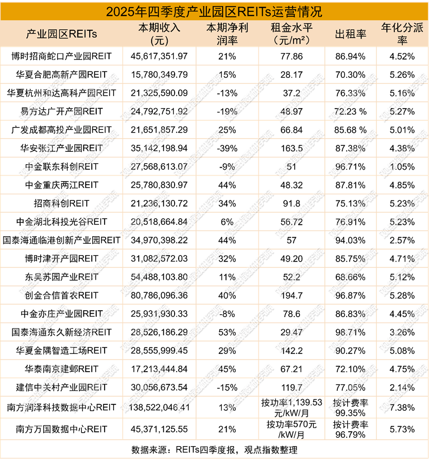 不过细分赛道呈现分化态势,南方润泽科技数据中心REIT、南方万国数据中心REIT四季度年化分派率分别达7.38%和5.83%,较前期分别提升3.3个和2.2个百分点,依托数据中心高景气赛道属性实现收益增长,与传统产业园区REITs形成差异化。