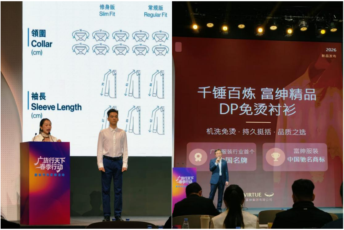 男装品牌“富绅”与“十如仕”在“一件好衬衫”上展开了技术竞赛。富绅集团副总裁邓文远展示了2026年首发的“高支成衣全棉免烫衬衫”,采用200支新疆长绒棉,通过成衣免烫技术,保证挺阔无皱、舒适顺滑。