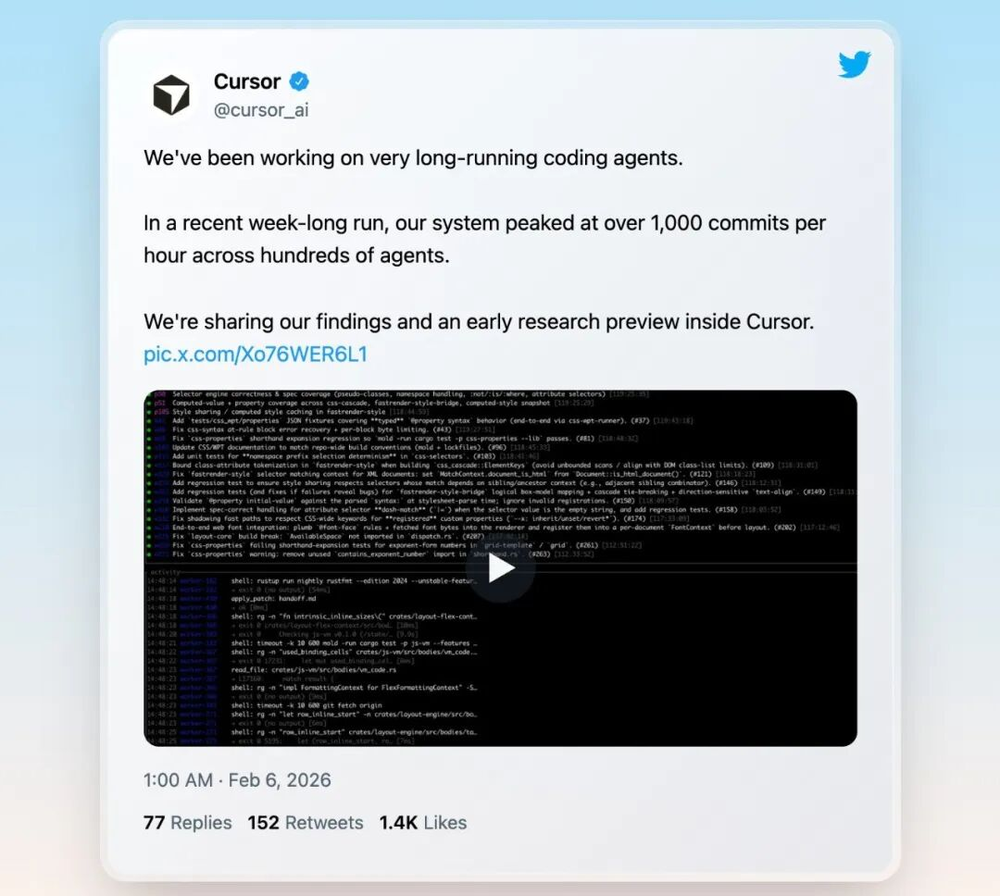 Cursor,那个最火的AI编程IDE,也在搞"Self-Driving Codebases"。本质也是多Agent协作。在他们的浏览器项目被全网群嘲之后,团队并没有放弃,仍然在尝试,最新的说法是:“在最近一次为期一周的运行中,我们的系统在数百个智能体上达到了每小时超过1000次提交的峰值。“
