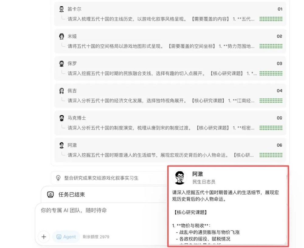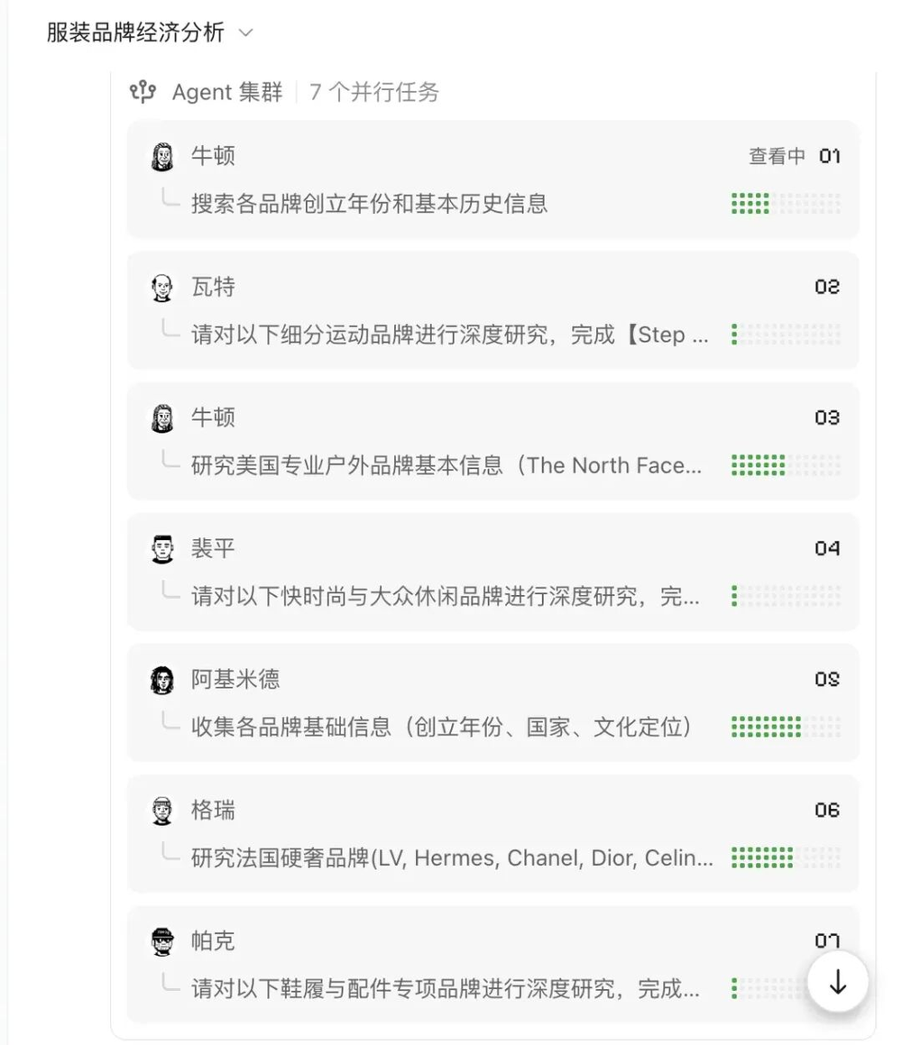 Kimi的这个集群我当时还试过,看着系统在自动生成每个Agent,并给每个Agent设定角色、分配任务、执行任务,再看看每个角色的提示词及进度条,甚至还有点感动,因为多agent系统把你的目标拆成了一个个具体的事项,再委派专人,真的有点将军坐帐前的感觉。