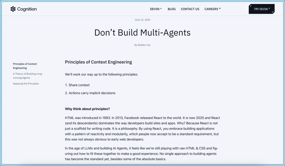 2025年6月12日,Cognition的CPO Walden Yan发了一篇文章,标题很直接:《Don't Build Multi-Agents》。