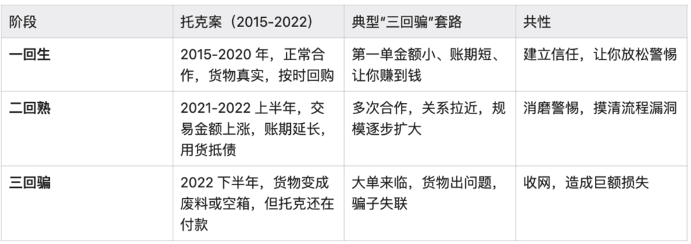 前几天,我写过一篇标题为,一回生,二回熟、三回骗的文章,我们再回头看看托克的这个案例,正好符合这篇文章。