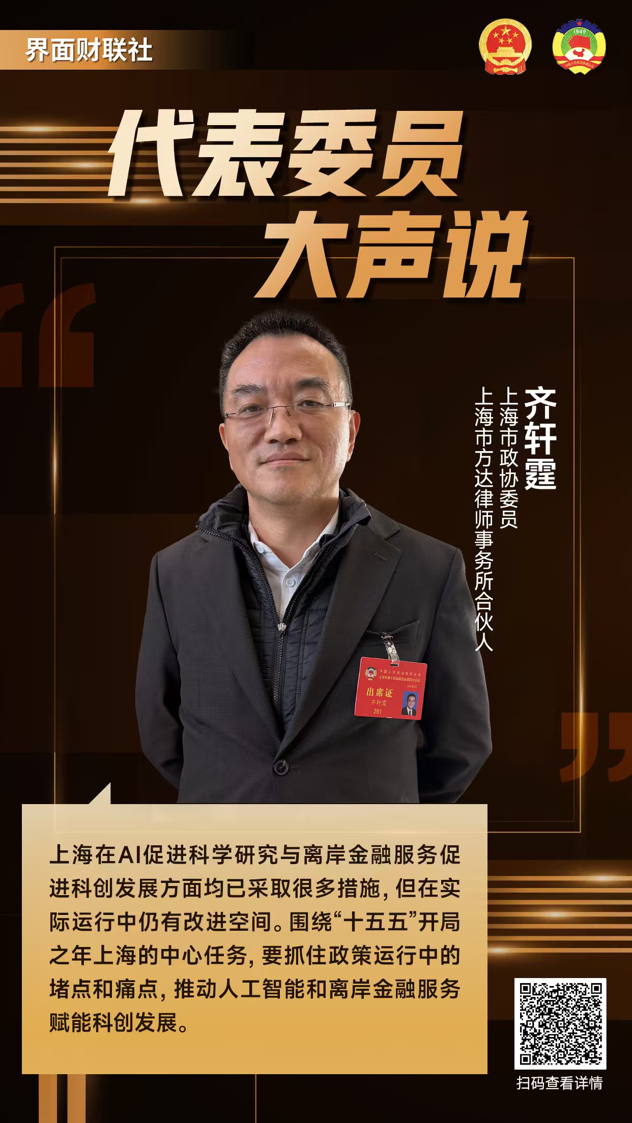 财联社2月6日讯(记者 沈娇娇 王彦琳)正在召开的上海两会上,上海市政协委员、上海市方达律师事务所合伙人齐轩霆聚焦人工智能与科研融合的协同机制、临港离岸及跨境金融生态,为上海科创政策改善献计献策。
