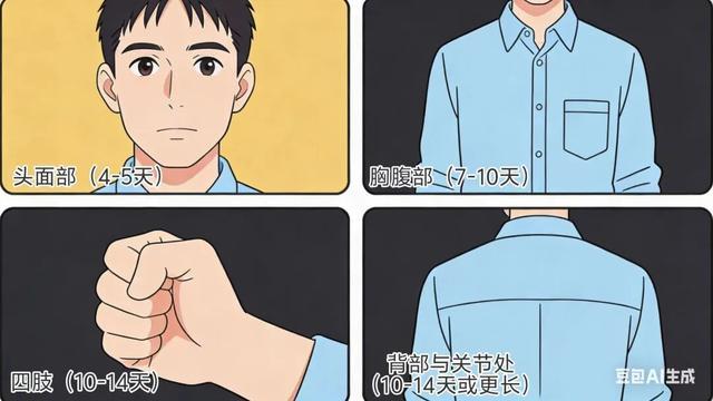 四肢(10-14 天):关节部位(膝关节、肩关节等)活动张力大,手足部位血供较少,整体愈合较慢。