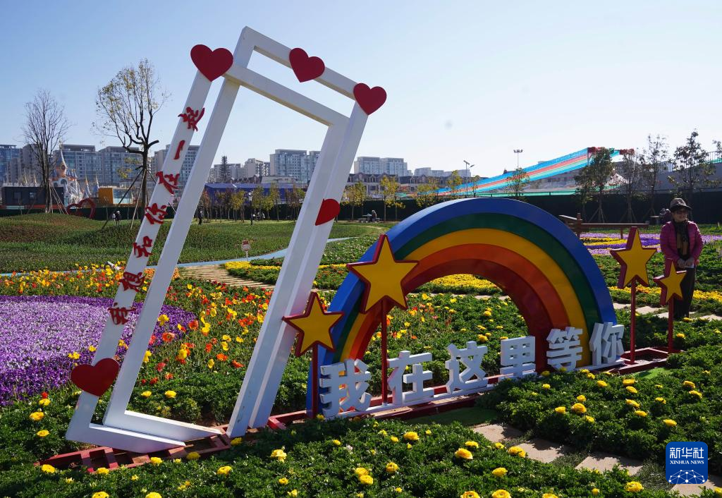 2月6日,游客在昆明七彩花海公园游览拍照。