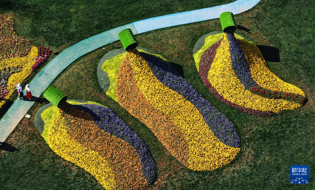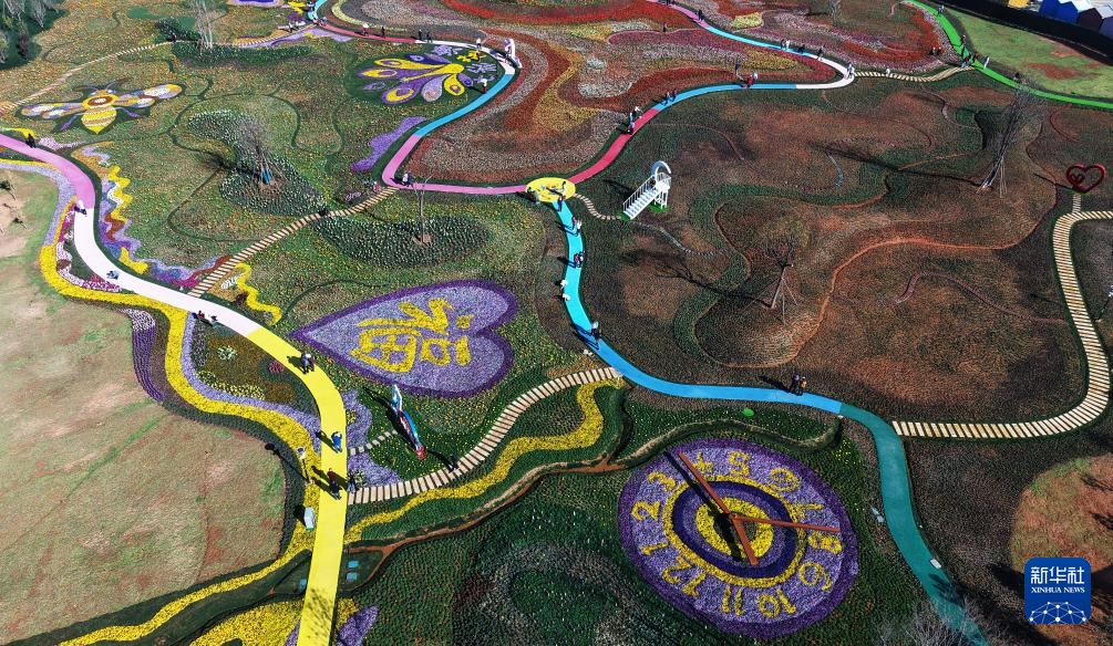 2月6日,游客在昆明七彩花海公园参观游览(无人机照片)。