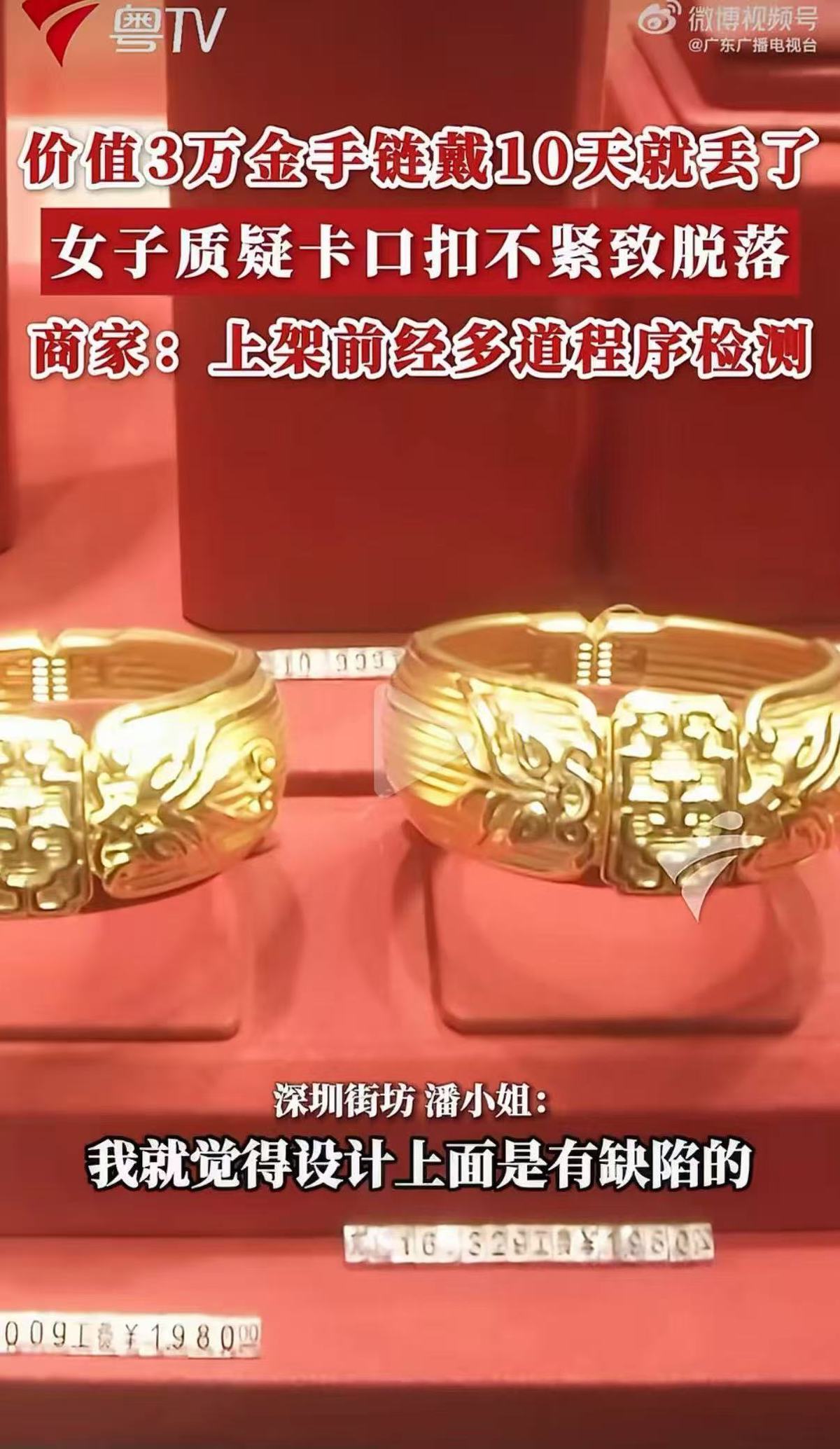 当下,金价暴涨,黄金饰品价格昂贵,动辄数万元。如果消费者戴着戴着就丢了,会心疼、会不甘都很正常。黄金饰品行业作为高价值消费品领域,理应对产品安全性和佩戴稳定性有更高标准。如果某种扣头设计确实存在脱落风险,即使是行业惯例,符合行业标准,也应主动改进或在售卖时提示相关风险,而非以“符合检测”为由推卸责任。
