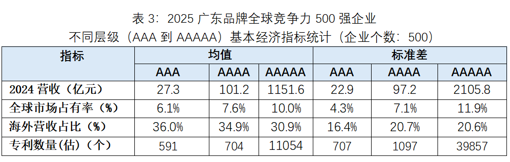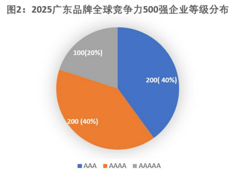 不同层级的企业差异显著:2025广东品牌全球竞争力500强企业中,AAAAA级企业 100家占比20%;AAAA级企业200家,占比40%;AAA级企业200家,占比40%。