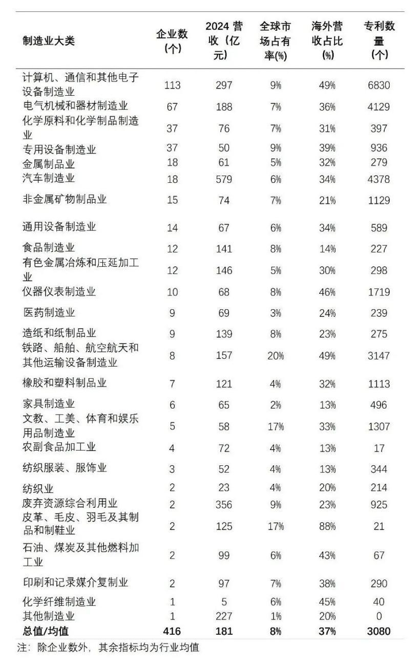 制造业与新型产业营收总盘惊人:仅Top10企业(华为、腾讯、比亚迪、华润、广药、美的、大疆、格力、广汽、中兴)2024年营收总和已突破4.2万亿人民币,这一体量超过新加坡、以色列等许多中等发达国家的GDP。此外,生物医药、新能源汽车、高端装备制造等战略新兴产业企业成为核心力量。在制造业中,计算机、通信和其他电子设备制造业有113家企业,占制造业企业总数27%,位列首位,与居于第二位的电气机械和器材制造业,合计占整个制造业43%,几乎是整个制造业半壁江山。其次,计算机、通信和其他电子设备制造业企业在营收水平、全球市场占有率、海外营收占比和专利数量都居于首位,与其它大类行业相比具有显著优势,形成以优势产业为龙头的省级经济竞争力发展路径。