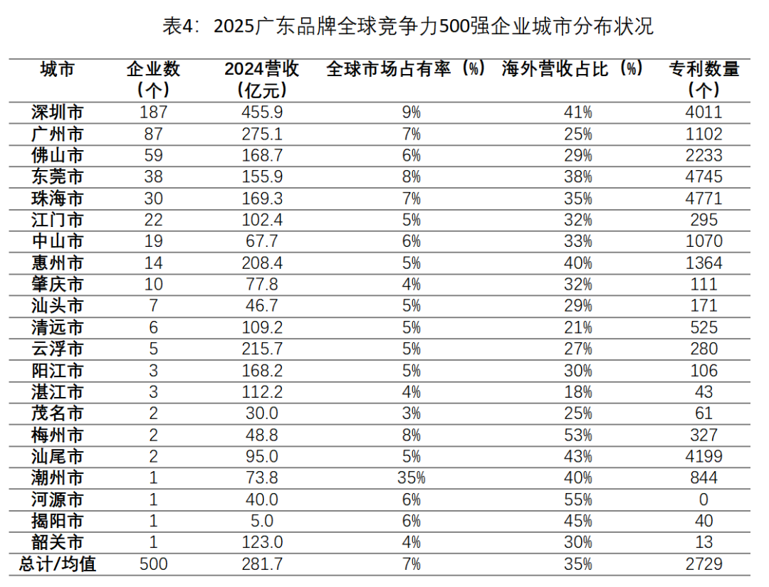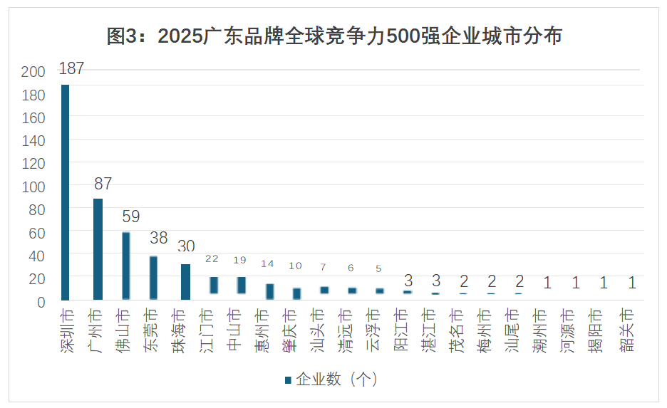 广东品牌在空间布局上呈现出鲜明“两个核心-外围”结构。2025年广东品牌全球竞争力500强企业中,深圳以187家上榜企业,广州和佛山以146家企业紧随其后,地域核心优势明显。仅这三座城市上榜企业数量就占全省总数66.7%。以两地为核心的珠三角区域经济具备完善产业配套、密集的创新资源与便捷的交通网络,已经形成强大产业集聚效应,成为广东品牌参与全球竞争“主阵地”。