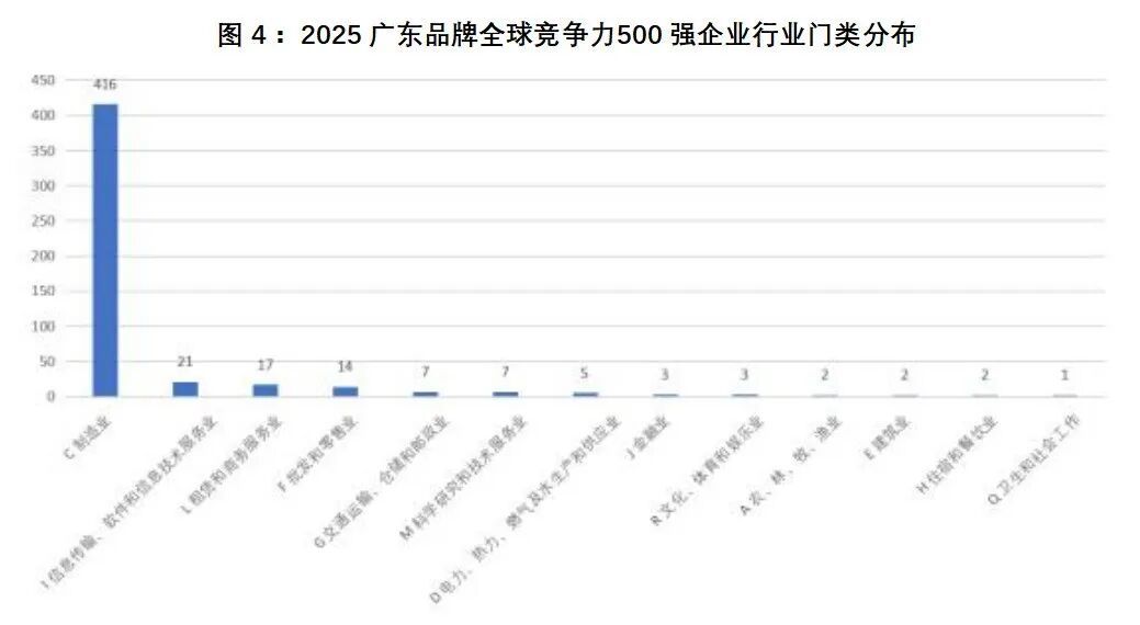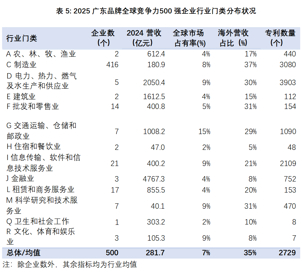2025广东品牌全球竞争力500强企业行业门类分布中,制造业以416家企业独占优势,占比达到83%,这是广东产业经济发展的强大基础和特色。另一方面,制造业企业营收平均水平180.9亿元,在各门类中属于中等偏下水平,而信息技术、交通运输、批发零售等服务行业营收水平较高,因此,产业协同和均衡发展也是广东省经济发展的努力方向。其次,制造业全球市场占有率为8%属中等偏上,但海外营收占比为37%居于门类中最高位,广东省外向型经济优势有极大部分来自于制造业企业的较高的全球竞争力水平。